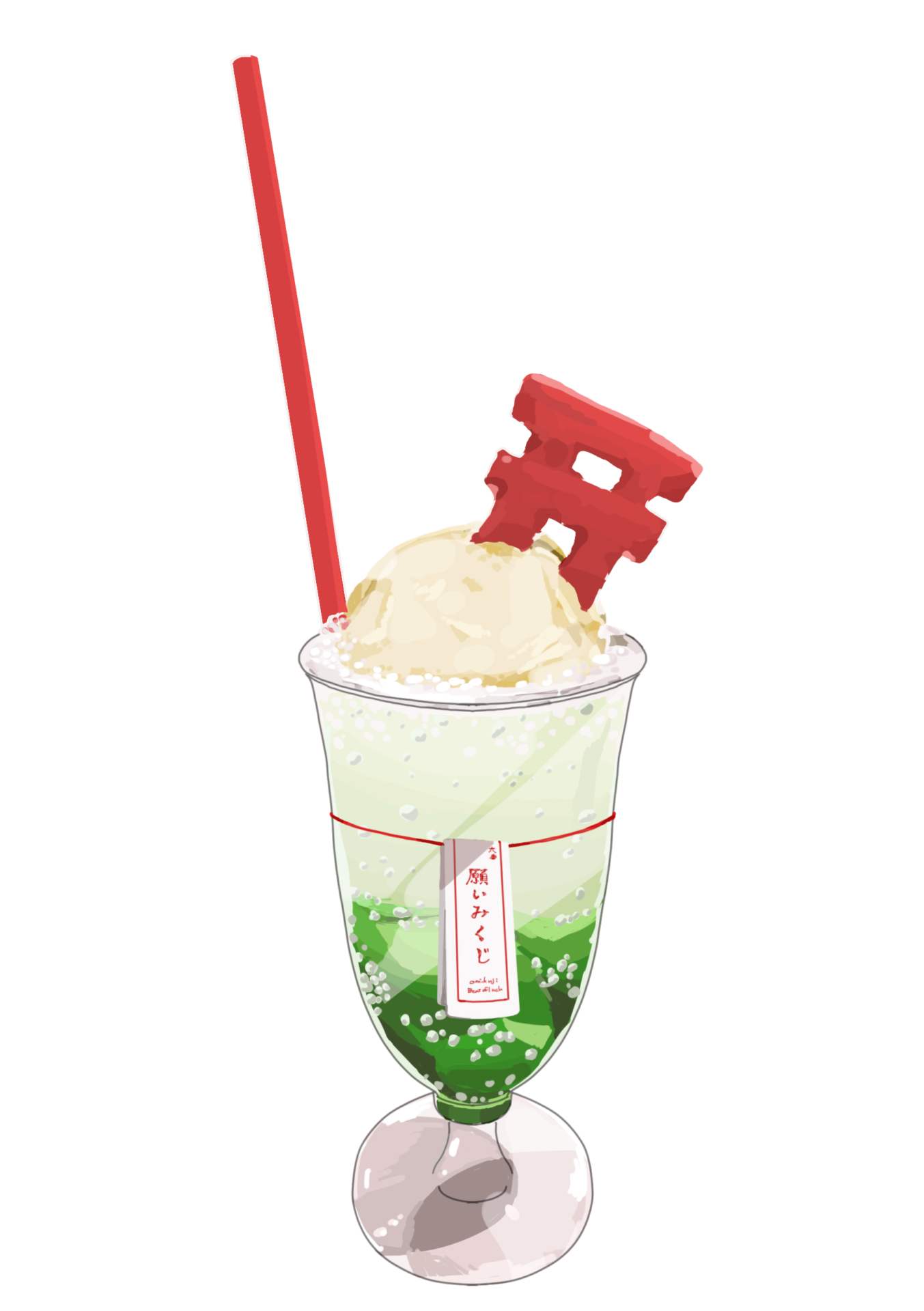神社をイメージした鳥居のクッキーがついた、可愛い見た目のクリームソーダです。 清々しい青色のブルーハワイ味は「目標達成」を願うのにピッタリ。澄み渡る青空、どこまでも広がる海のように無限の可能性を感じさせてくれます。 甘く冷たいバニラアイスがどこか懐かしさを感じさせる1杯です。